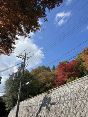 奥池町の住宅はどれも丁寧に手入れされており、庭の紅葉が家々の表情をより豊かにしています。日本の住宅文化には「自然を取り込む」という考え方がありますが、奥池町を歩いているとその価値観が今も息づいていることがよくわかります。不動産広告を配りながら、「こうした景色の中で暮らせるのは大きな魅力だな」と改めて実感しました。